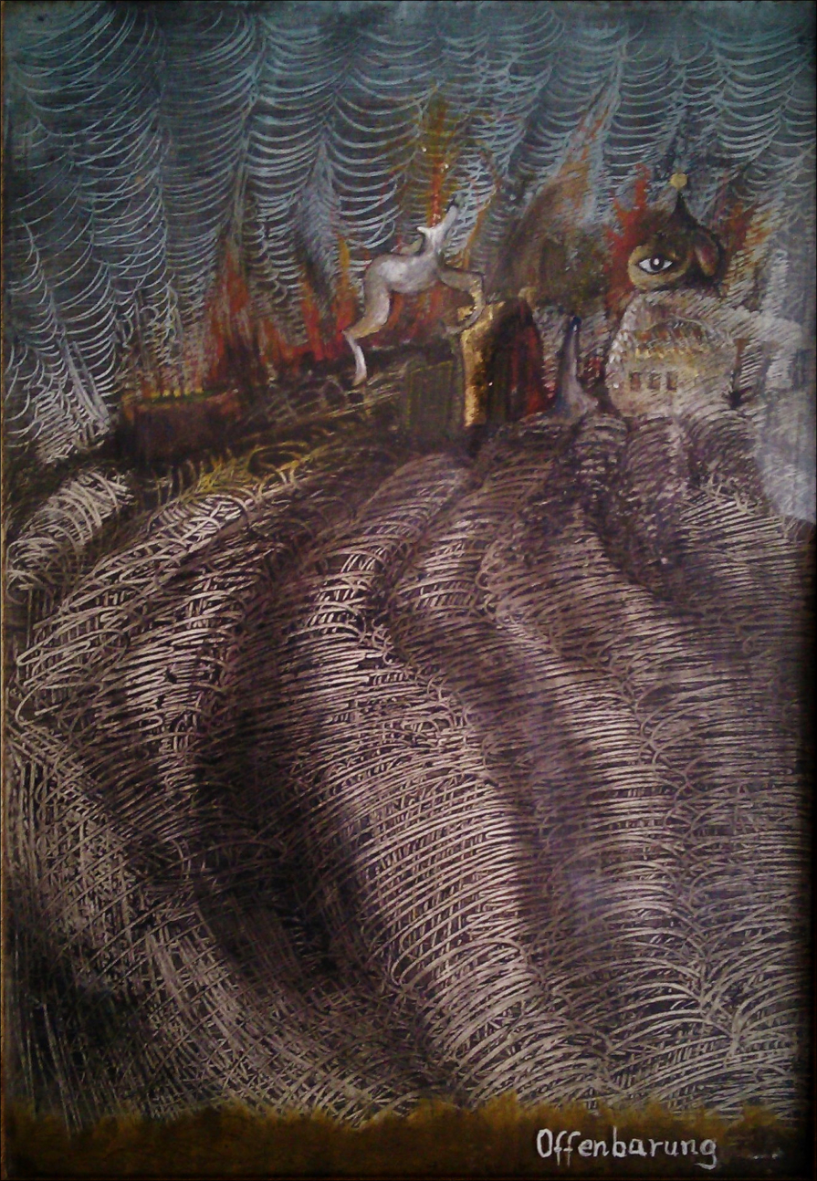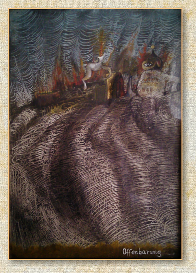 Besondere Techniken. Das Bild “Offenbarung” entstand zum Großteil durch Wegkratzen der Farbe auf einer Wachsmischung. Ca. 1986