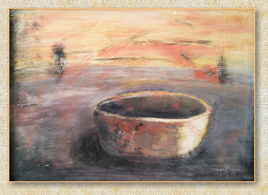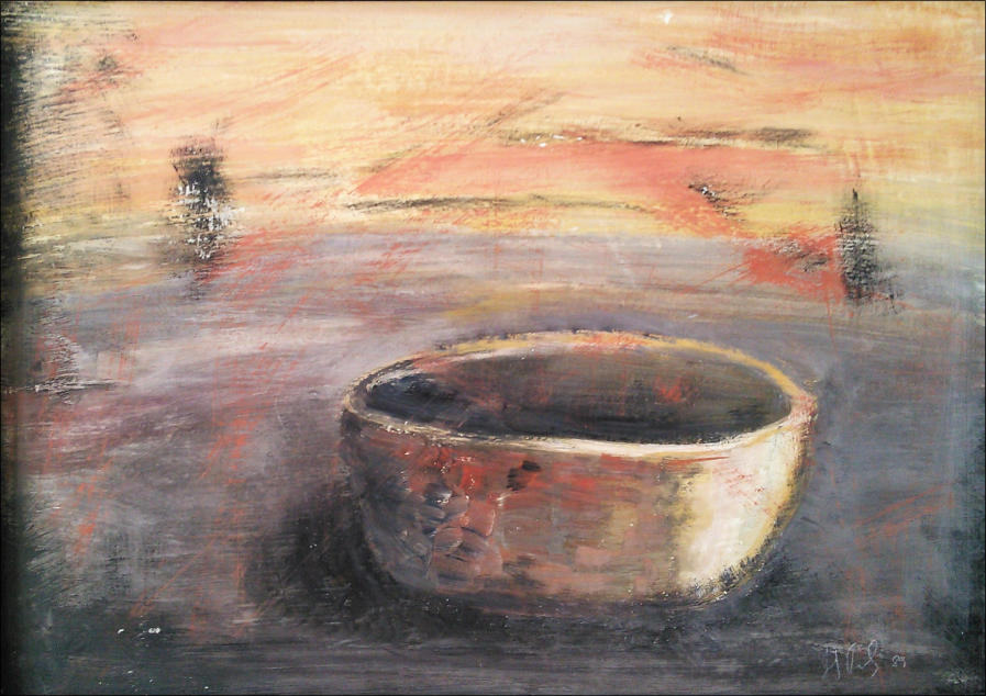 Bei der “Tonschüssel in Wüstenlandschaft” handelt es sichum eine Gouache auf Kreidegrund aus dem Jahr 1989.