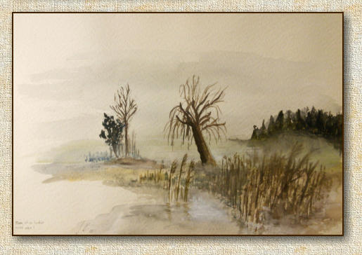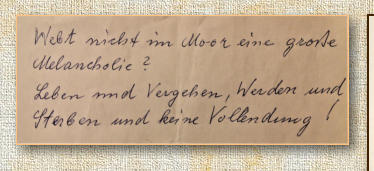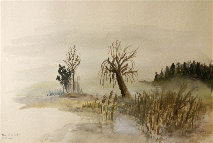 Dieses Aquarell entstand 1980. Gemeinsam mit meiner Großmutterunternahm ich einen Ausflug in ein Moor, das nicht den Erwartungen entsprach. Am Abend entstand dann zuhause das nebenstehende Aquarell mit dem Titel “Das Moor, wie es leider nicht war” (40x28cm).Der originalhandschriftliche Text meiner GroßmutterAlice Neukirch (1909-1995) bezieht sich wahrscheinlich auf diesesBild.